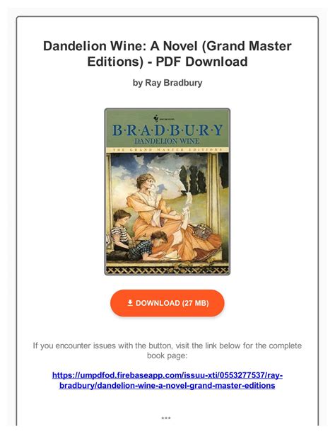Dandelion Wine Grand Master Editions Reader By Click Button. Dandelion Wine Grand Master Editions it’s easy to recommend a new book category such as Novel, journal, comic, magazin, ect. You see it and you just know that the designer is also an author and understands the challenges involved with having a good book. You can easy klick for detailing book and you can read it online, even you can download it